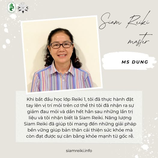 Khi bắt đầu học lớp Reiki 1, tôi đã thực hành đặt tay lên vị trí mỏi trên cơ thể thì tôi đã nhận ra sự giảm đau mỏi và dần hết hẳn sau những lần trị liệu và tôi nhận biết là Siam Reiki.