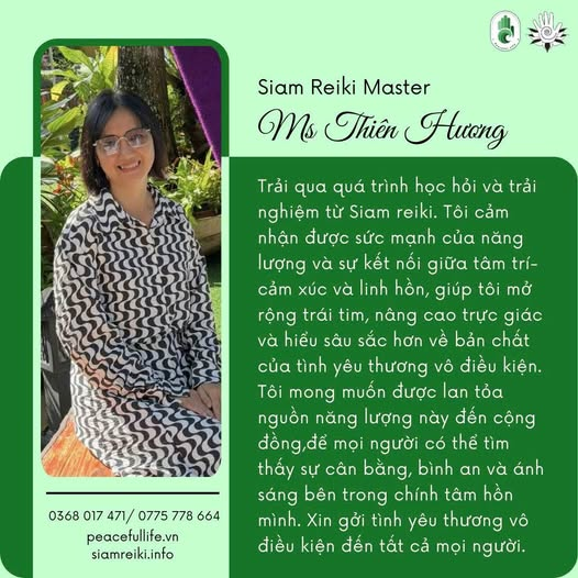 Trải qua quá trình học hỏi và trải nghiệm từ Siam Reiki. Tôi cảm nhận được sức mạnh của năng lượng và sự kết nối giữa tâm trí – cảm xúc và linh hồn, giúp tôi mở rộng trái tim, nâng cao trực giác và hiểu sâu sắc hơn về bản chất của tình yêu thương vô điều kiện. Tôi mong muốn được lan tỏa nguồn năng lượng này đến cộng đồng,để mọi người có thể tìm thấy sự cân bằng, bình an và ánh sáng bên trong chính tâm hồn mình. Xin gởi tình yêu thương vô điều kiện đến tất cả mọi người.
